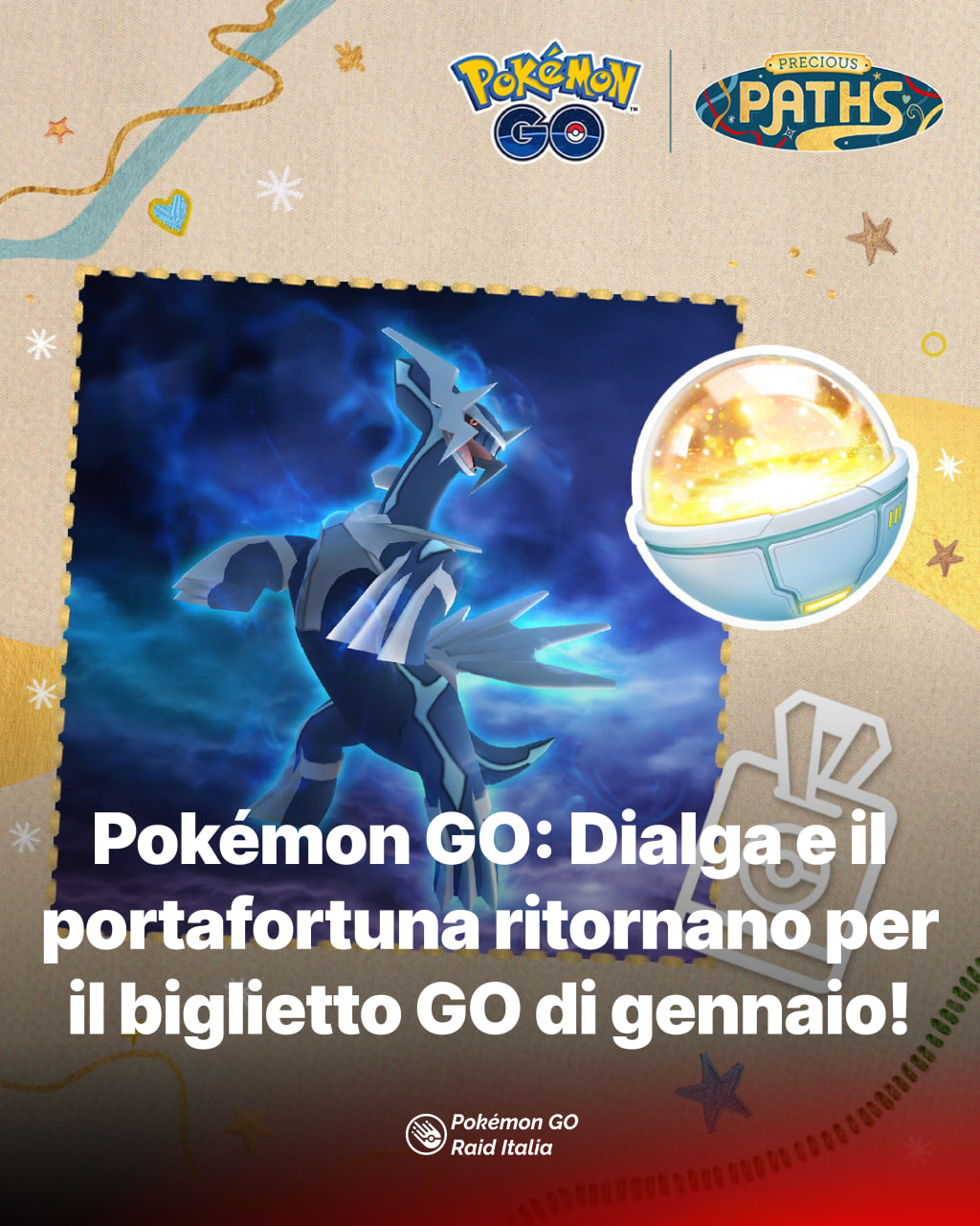 Pokémon GO: Dialga e il portafortuna ritornano per il biglietto GO di gennaio!