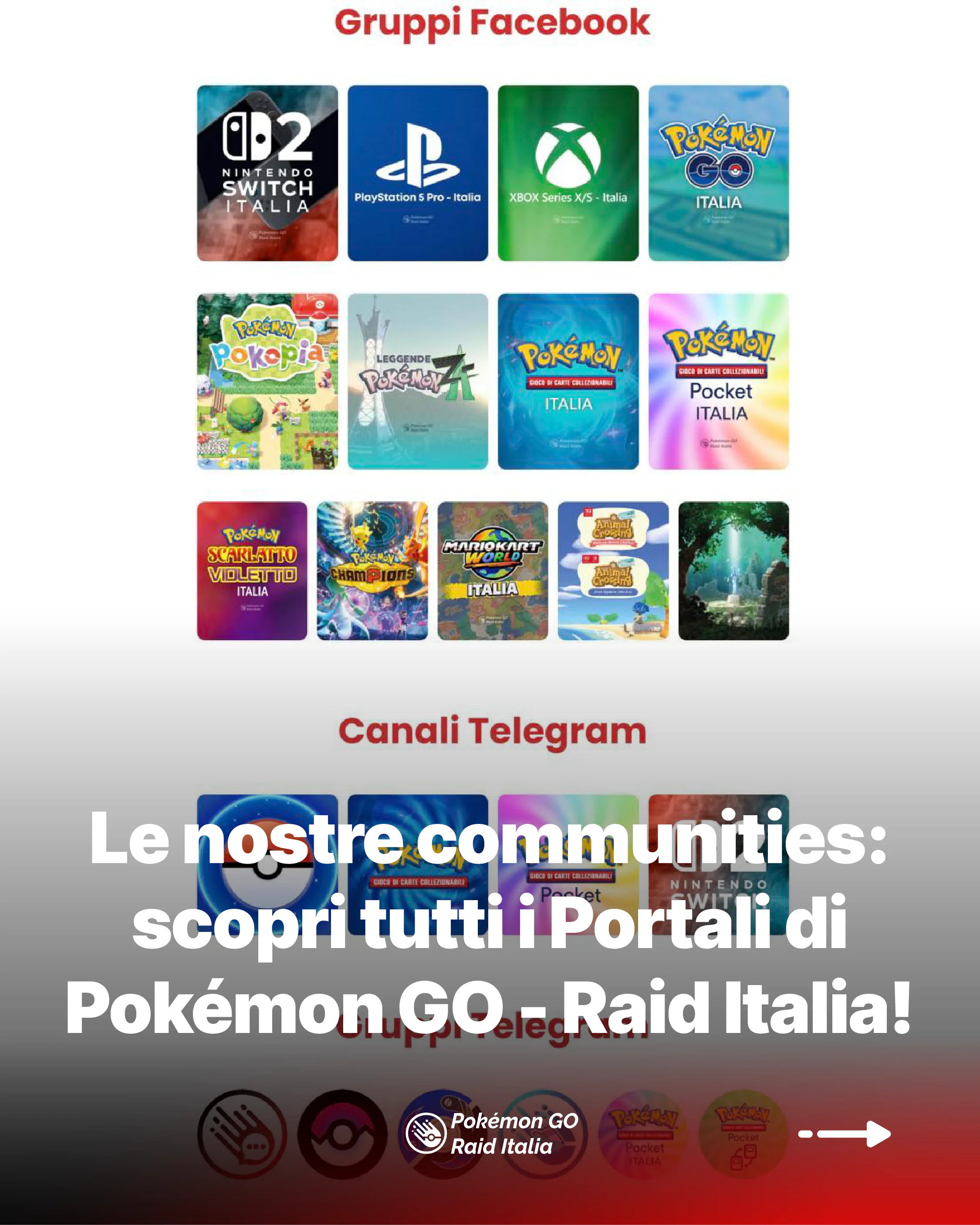 La community è da sempre il cuore di Pokémon GO – Raid Italia, ed è proprio per questo che abbiamo creato una nuova pagina del sito interamente dedicata ai nostri spazi social: nasce Le nostre communities, il punto di riferimento per entrare in contatto con migliaia di appassionati di videogiochi e intrattenimento digitale.