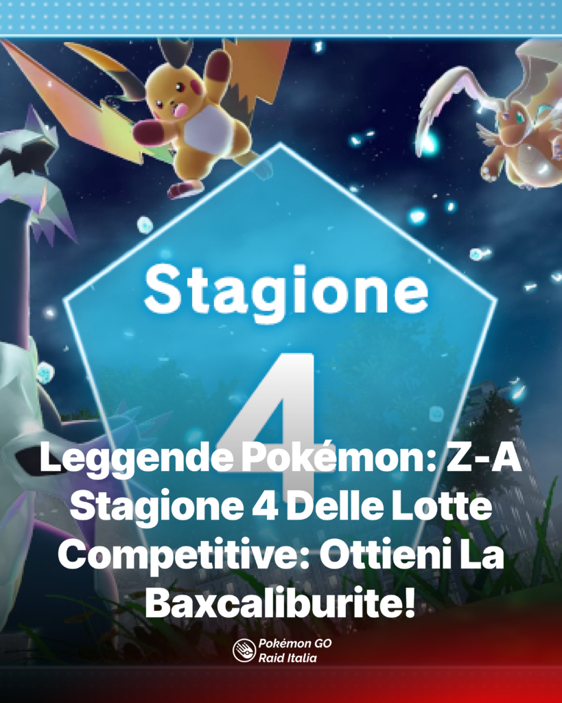 È ufficialmente iniziata la Stagione 4 delle Lotte Competitive del Club Lotta Z-A e porta con sé ricompense esclusive, tra cui una Baxcaliburite ottenibile raggiungendo il rango S. Un’occasione imperdibile per gli Allenatori che vogliono potenziare il proprio team con Megapietre rare e strumenti avanzati per l’allenamento.